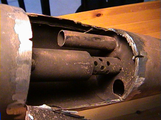 The inside view of the GN400 exhauster. I had to open it, because one of the two tubes inside (the lowest on the picture) has been broken (you see the open hole). The slack tube made a terrible mechanical noise in the exhauster. Therefore I decided to weld it, but therefore I had to open the exhauster using a angle grinder.