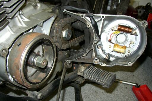 The GN400 with open generator cover to see the technic behind it. In the middle you can see the wheel, behind of it the chain and inside of the cover you can find the coils.