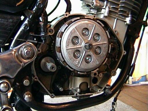 The GN400 with open clutch cover to see the technic behind it. In the middle you can see the clutch, below it is the inner part of the oil filter visible and on the left side the shaft of the kick-starter can be seen. After nearly 20 years the seal of the clutch cover begun to leak. To open the cover you will need an impact driver, otherwise you will destroy the screws.